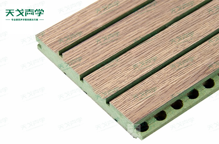 天戈防潮槽木吸音板是一種在密度板的正面開槽、背面穿孔的狹縫共振吸音材料。防潮槽木吸音板對吸聲頻譜選擇性很強,對中低頻有很好的吸聲性能。若在吸聲結(jié)構(gòu)后空腔填入適量的吸聲棉可提高中、高頻吸聲效果,標準化模塊設(shè)計,采用插槽、龍骨結(jié)構(gòu),安裝簡易,常用于墻面或天花裝飾。