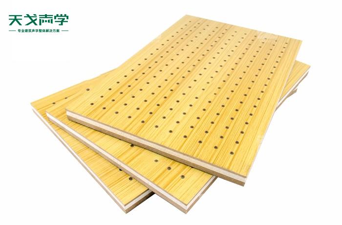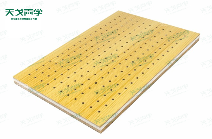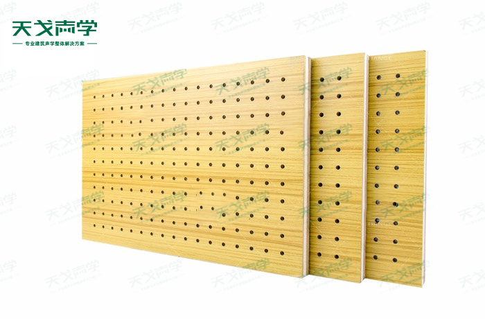 天戈復合孔木吸音板飾面顏色及材料選擇性廣,孔徑、孔距可根據(jù)客戶要求調整,能很好地滿足客戶多樣化的聲學及裝飾需求。孔木吸音板對吸聲頻譜選擇性較強,對中低頻有很好的吸聲性能。如在吸聲結構后空腔上填入適量的吸聲棉可提高中、高頻吸聲效果。