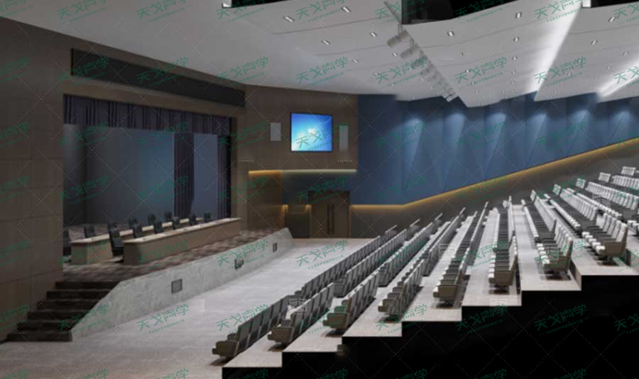 多功能廳的聲學設(shè)計方面,根據(jù)《劇場、電影院和多用途廳堂建筑聲學設(shè)計規(guī)范》(GBT50356-2005)的規(guī)定,多功能廳觀眾廳有效容積V約2250m3,根據(jù)容積選擇中頻500-1000Hz滿場混響時間T≤0.9±0.10s;多工能廳定位主要為滿足學術(shù)匯報,舉辦中小型會議及文藝演出功能。鑒于以上使用功能,為了方便監(jiān)控人員對舞臺進行實時監(jiān)控和即使切換節(jié)目,建議在觀眾席后排增加一個控制室。但是后排需減少座位17個,現(xiàn)有容納人數(shù)約為473人。多功能廳的設(shè)計理念有“激昂青春”“充滿生機的沃土”“揮灑汗水、茁壯成長”“迸發(fā)活力、向著未來奮進”,設(shè)計效果上木紋代表著陽光、朝氣,生機,以黃色為背景色,綠色襯托,突顯風格搭配 ,綠色營造出活力向上,團隊拼搏的氛圍 ,輔以規(guī)則矩形糟木條排列視覺的呈現(xiàn) ,有力度地詮釋當代少年積極陽光的態(tài)度內(nèi)涵。墻身采用陶晶砂吸音板進行造型設(shè)計;天花采用雙層石膏板進行造型設(shè)計;觀眾地面材料PVC塑膠地板;舞臺地面采用專用舞臺地板;座椅采用專用禮堂座椅。