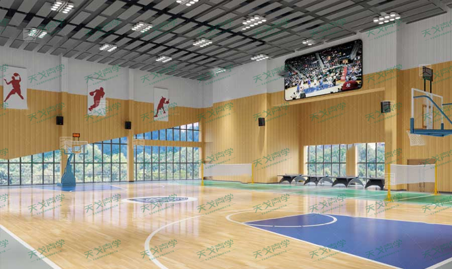 體育館的聲學設(shè)計方面,混響時間是體育館音質(zhì)評價的重要技術(shù)指標。體育館主要滿足學生訓練及比賽的聲學要求,因此聲環(huán)境要求必須做到語言清晰,足夠的響度,聲場分布均勻。根據(jù)《體育場館聲學設(shè)計及測量規(guī)程》JGJ/T131-2012的規(guī)定,體育館有效容積V約11000m3,根據(jù)容積選擇中頻500-1000Hz滿場混響時間T≤1.4±0.10s;體育館定位為滿足學生籃球、羽毛球訓練及比賽需求。在建筑聲學裝修及電聲系統(tǒng)上均圍繞該功能進行設(shè)計??紤]多功能廳已有舉辦會議功能,因此將體育館舞臺區(qū)域改成乒乓球區(qū)。滿足多種球類運動功能。為了解決體育館顫動回聲及多重回聲的音質(zhì)缺陷,有效控制場館中頻混響時間達到(500-1000Hz)1.4s±0.1s,初步方案,墻身采用紅玻槽孔吸聲結(jié)構(gòu);天花全頻空間吸聲體;地面材料PVC塑膠地板;
