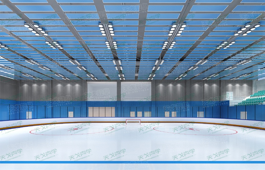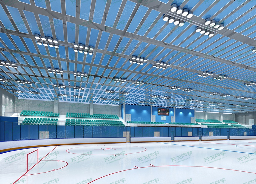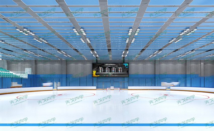 因冰球館內(nèi)存在顫動(dòng)回聲、聲聚焦和回聲等聲學(xué)缺陷,需要對(duì)聲學(xué)材料進(jìn)行合理布置,以達(dá)到消除各種聲學(xué)缺陷。為使該冰球館內(nèi)混響時(shí)間能達(dá)到合理水平,我們天戈聲學(xué)對(duì)該冰球館提出了相應(yīng)建筑聲學(xué)設(shè)計(jì)方案,最終使該體育館獲得了良好的音質(zhì)效果。我們選擇在冰球館墻面安裝藍(lán)色槽鋁吸音板,可以消除比賽池的顫動(dòng)回聲。天花同樣懸掛藍(lán)色空間吸聲體,以便有效地降低了館內(nèi)的混響時(shí)間,同時(shí)大幅削弱頂棚聲反射能力,消除了頂棚多重回聲問(wèn)題。