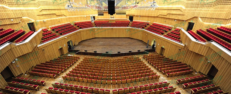 4、觀眾席是交響樂廳內(nèi)最重要的吸聲面,中高頻的吸聲量占到整個交響樂廳總吸聲量的80%左右,對廳內(nèi)的實際混響時間影響很大。因此,選擇座椅的形式及用料并控制其聲學性能,成為交響樂廳音質(zhì)設計的重要環(huán)節(jié)。對于該交響樂廳,要求座椅在空椅和坐人兩種條件下的吸聲性能盡可能接近,使得在空場和滿場條件下觀眾席廳內(nèi)的聲場音質(zhì)效果無較大的變化;坐墊翻動時不產(chǎn)生噪聲,尤其不允許產(chǎn)生碰撞聲;座椅宜采用木靠背及木扶手,靠背宜留木邊框,同時靠背軟墊不需太厚;坐墊下底面宜做吸聲處理,天戈聲學建議局部采用穿孔木板面。