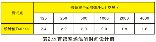 因該館業(yè)主前期不了解聲學(xué)的重要性,導(dǎo)致在建設(shè)過程中沒有考慮建筑聲學(xué)設(shè)計,竣工后體育館內(nèi)聽音模糊,聲學(xué)缺陷嚴(yán)重,回聲很大,難以滿足體育館的功能需求;在設(shè)計前設(shè)計師對現(xiàn)場進行了聲學(xué)測試,測試結(jié)果如下: